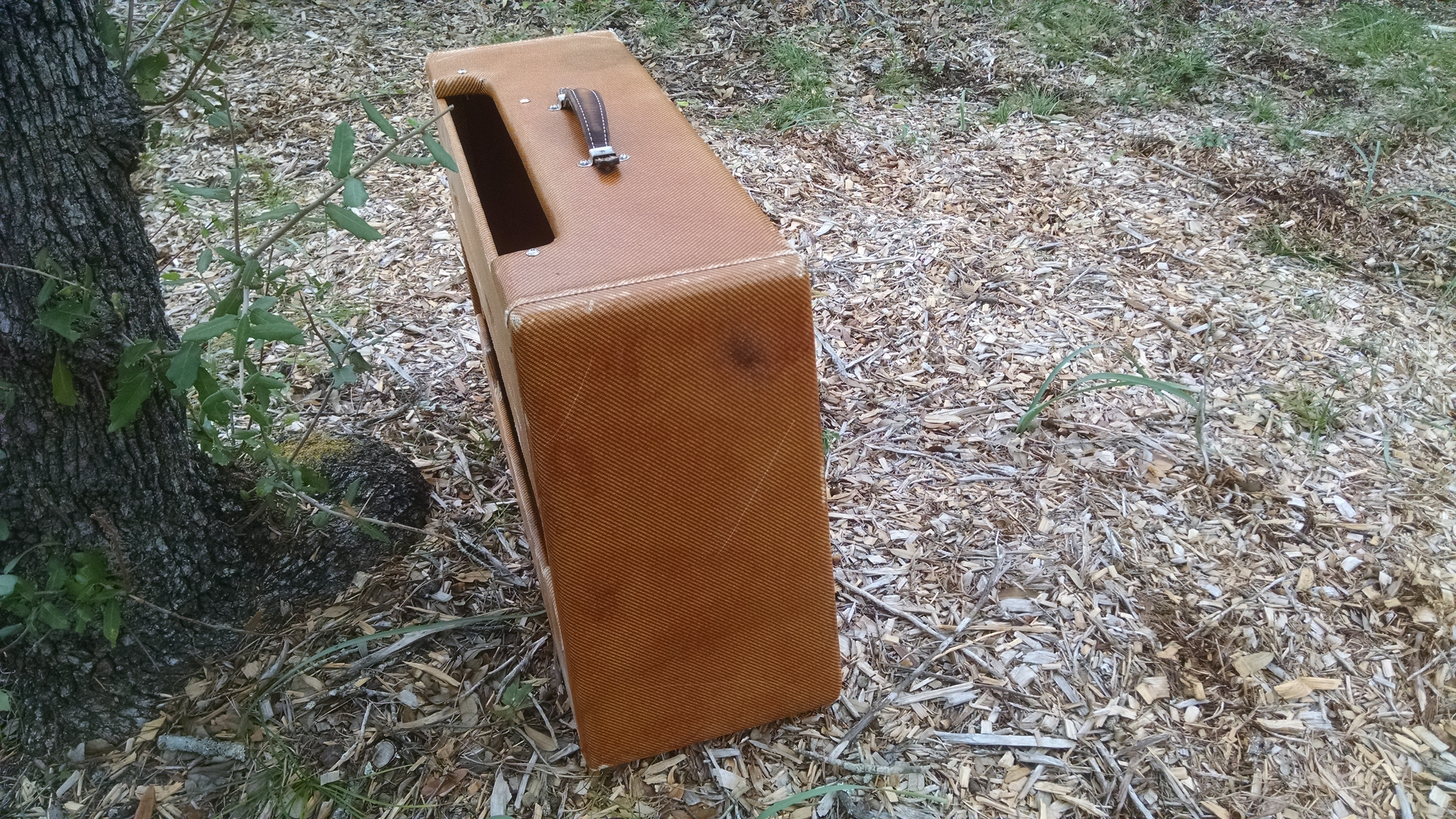 It was in not too bad of shape, but did need quite a bit of work. I built a new baffle and installed the original grill cloth, which had be already re-installed on a sub par baffle. I had to drill and install another wooden dowel where the cabinet had cracked next to one of the chassis bolts, this is pretty common with the old tweeds. It took a bit of bondo work to raise up some corners and patch some places in the cabinet. I was able to use both original back panels and I installed a new leather handle using the original clips as well as new feet, chassis bolts, and back panel screws. Here are some pics of the before and after.